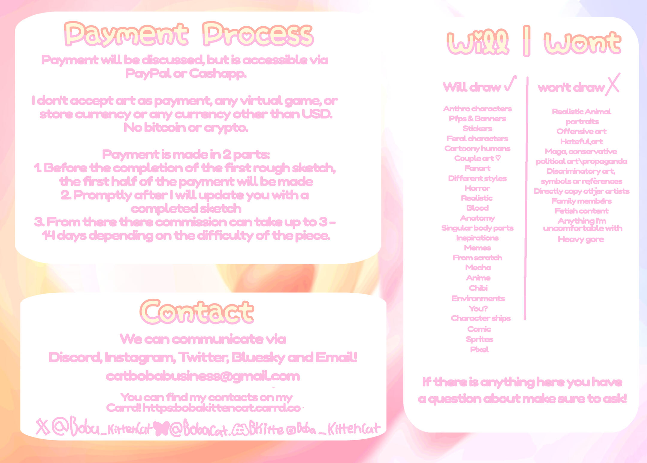 I have the right to refuse a requestI retain the rights to my artwork.I can post your commission with my watermark onto my social media's unless you request otherwise.I can post your commission onto my portfolio with my watermark.If my artwork is shared on any platform, social media or used in a profile picture or banner credit me accordingly.If I'm unable to finish a commission I can offer a refund.I don't refund if you cancel after the first sketch. If I cancel I will offer a refund.Art revisions after a piece has been completed are limited to 5 until the price increases.You must let me know if my artwork will be used for commercial purposes.